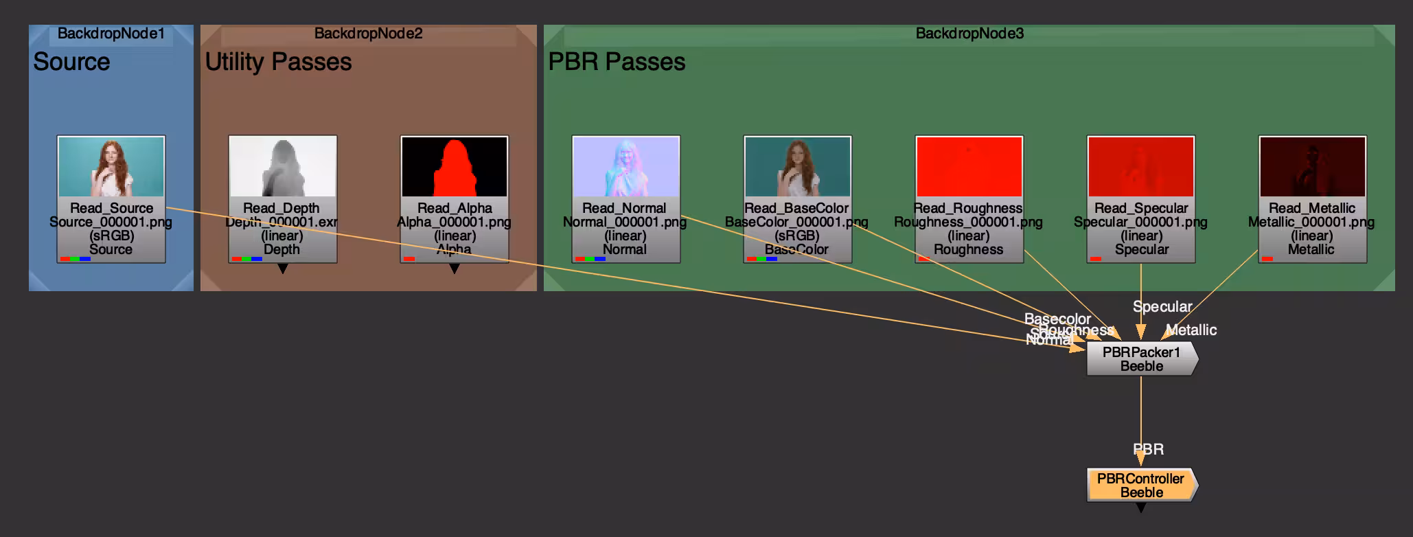 | PBRPacker | Source, Normal, Basecolor, Roughness, Specular, Metallic (6 inputs) | PBR (multi-layer) | Packs individual passes into a single stream with layers |