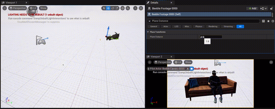 Distance-Based Scaling: When you change the distance between the Beeble Footage and the Beeble Camera using the Plane Distance setting, the plane automatically resizes to maintain proper proportions and accurate projection.