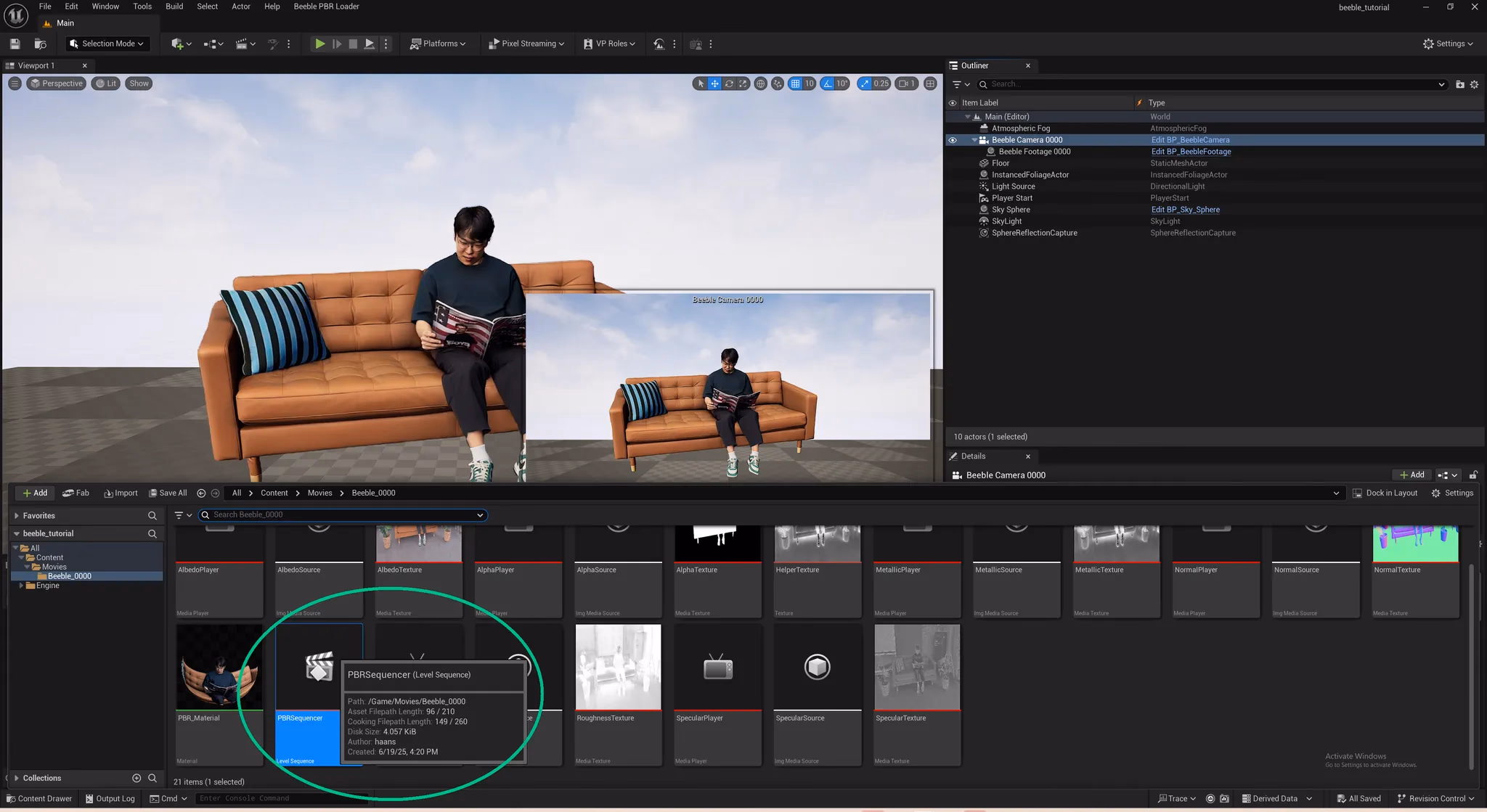 After successfully loading the VFX Pass directory, two actors will be visible in the outliner: Beeble Camera and Beeble Footage. Also, upon opening Content Drawer (located at bottom), a Beeble_0000 folder along with its associated assets will be automatically created.