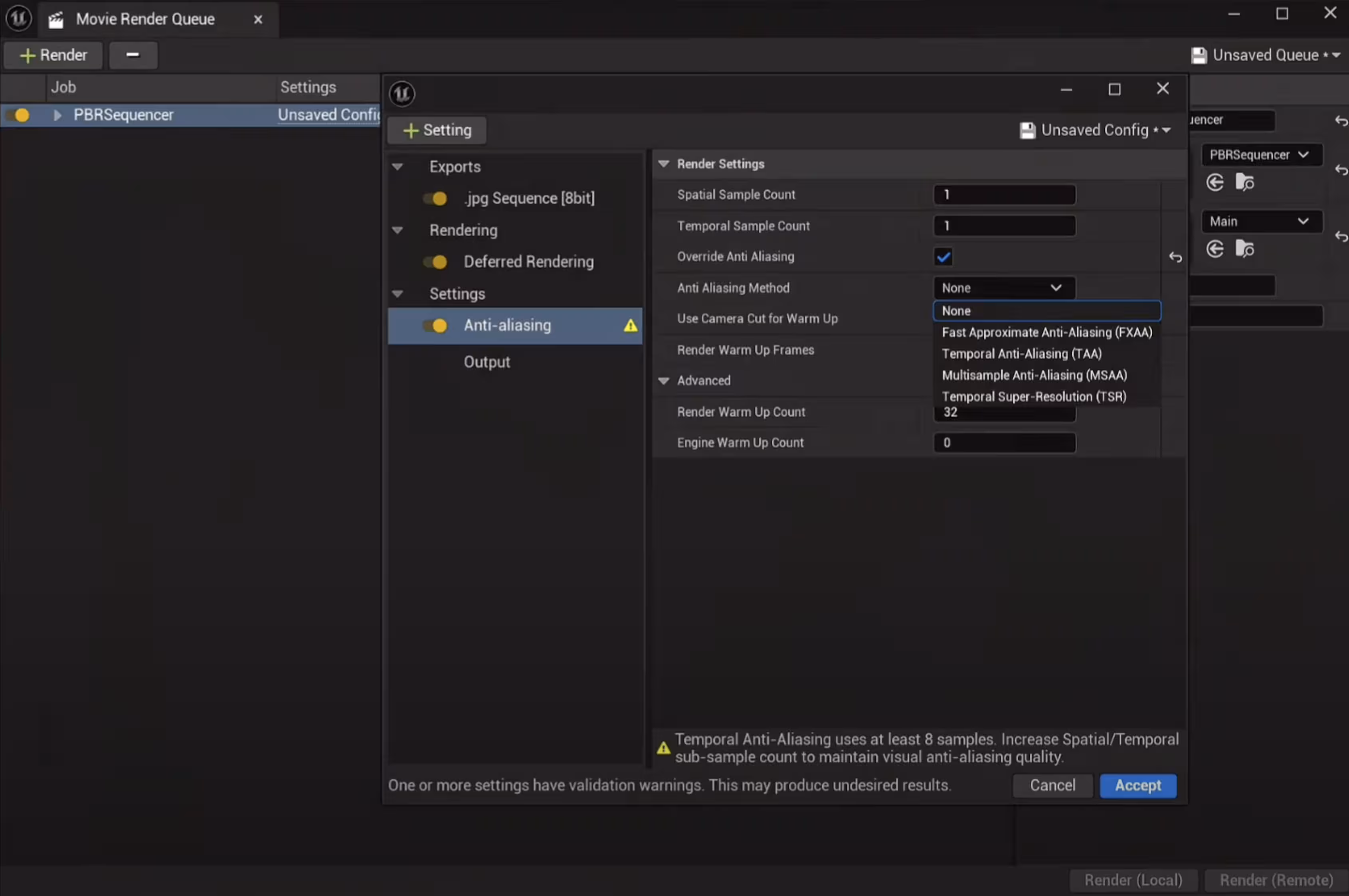 Open the settings configuration. Add Anti-aliasing to the settings list. Enable Override Anti Aliasing and select either None, FXAA, or MSAA. These options are recommended because temporal methods like TSR and TAA blend data from previous frames, which can cause ghosting artifacts.