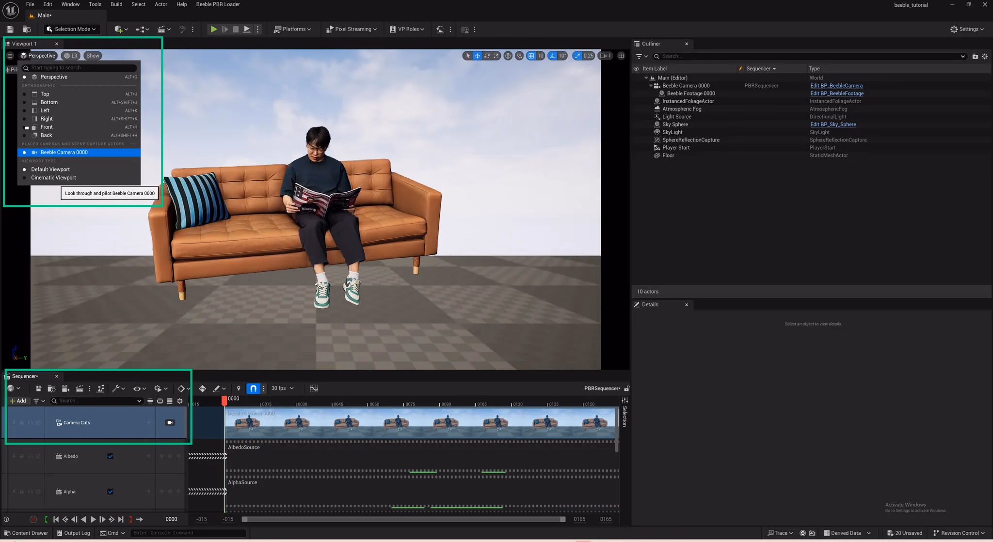 In Sequencer panel, you can find VFX Passes are added together with Camera Cut and Beeble Camera. To view the scene from the perspective of the Beeble Camera, simply click the Perspective button.